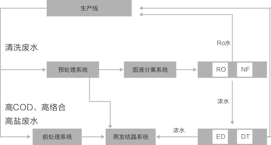 本技術一般用于反滲透脫鹽后濃水的處理,由前處理、膜分離、蒸發結晶等技術集成。可實現廢水的零排放。